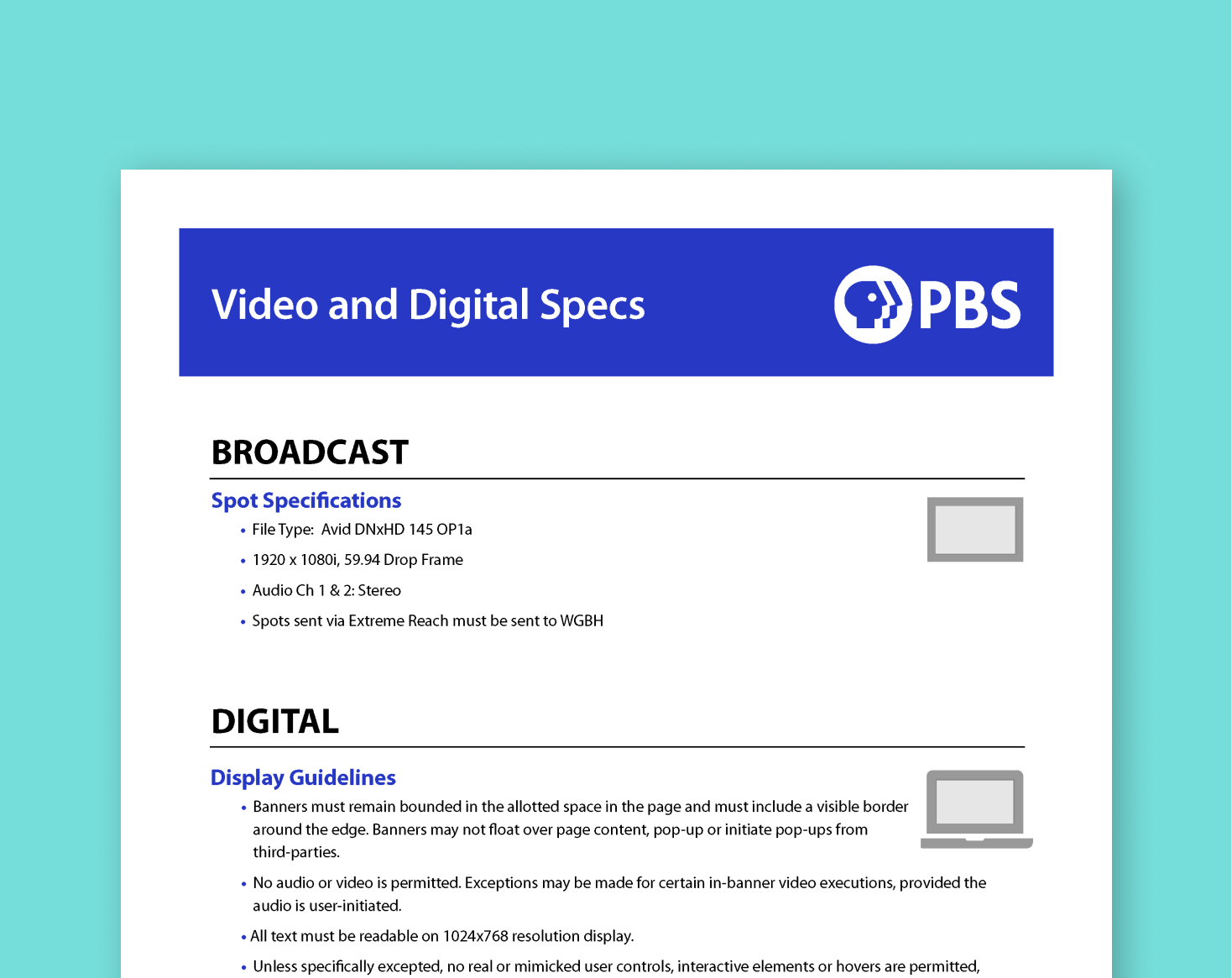 Check out the full list of our technical creative specifications for developing video and digital spots for PBS platforms, to ensure your spots are created in the correct format and are displayed in the best light.